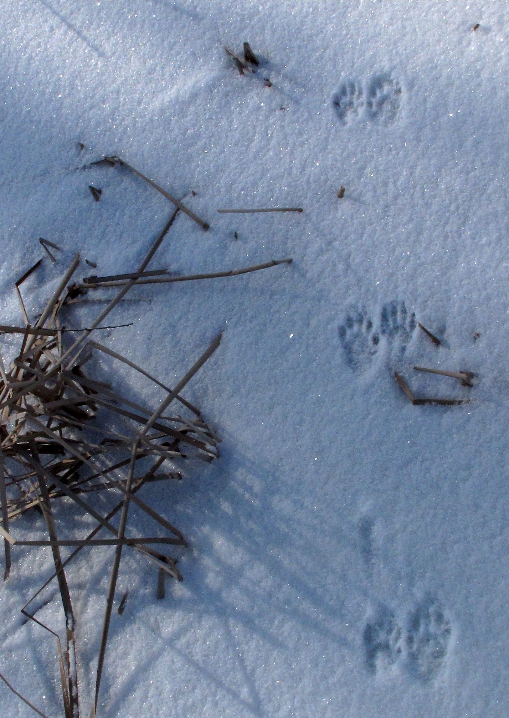 Recently I wandered into the gut over the ice to get a closer look at last year’s nests. We ventured first up Riley Brook and early on had a close encounter with the thin and treacherous ice of a ‘frozen’ brook. Despite extremely prolonged cold temperatures the ice was not safe to walk. Instead we drove around to where we keep our canoe on Lake Champlain. Armed with many layers of clothing, cameras and binoculars (in case of an eagle sighting), we walked north along the lake edge to the opening of the gut – passing ice fisherman shanties, summer camps and a few homes. As we walked over the very thick ice the thin dusting of snow was marked by other lake inhabitant’s foot prints. Clearly hungry creatures wander these shores. We saw what must have been fox prints, perhaps some coyote prints, and definitely raccoon footprints patrolling the shores.