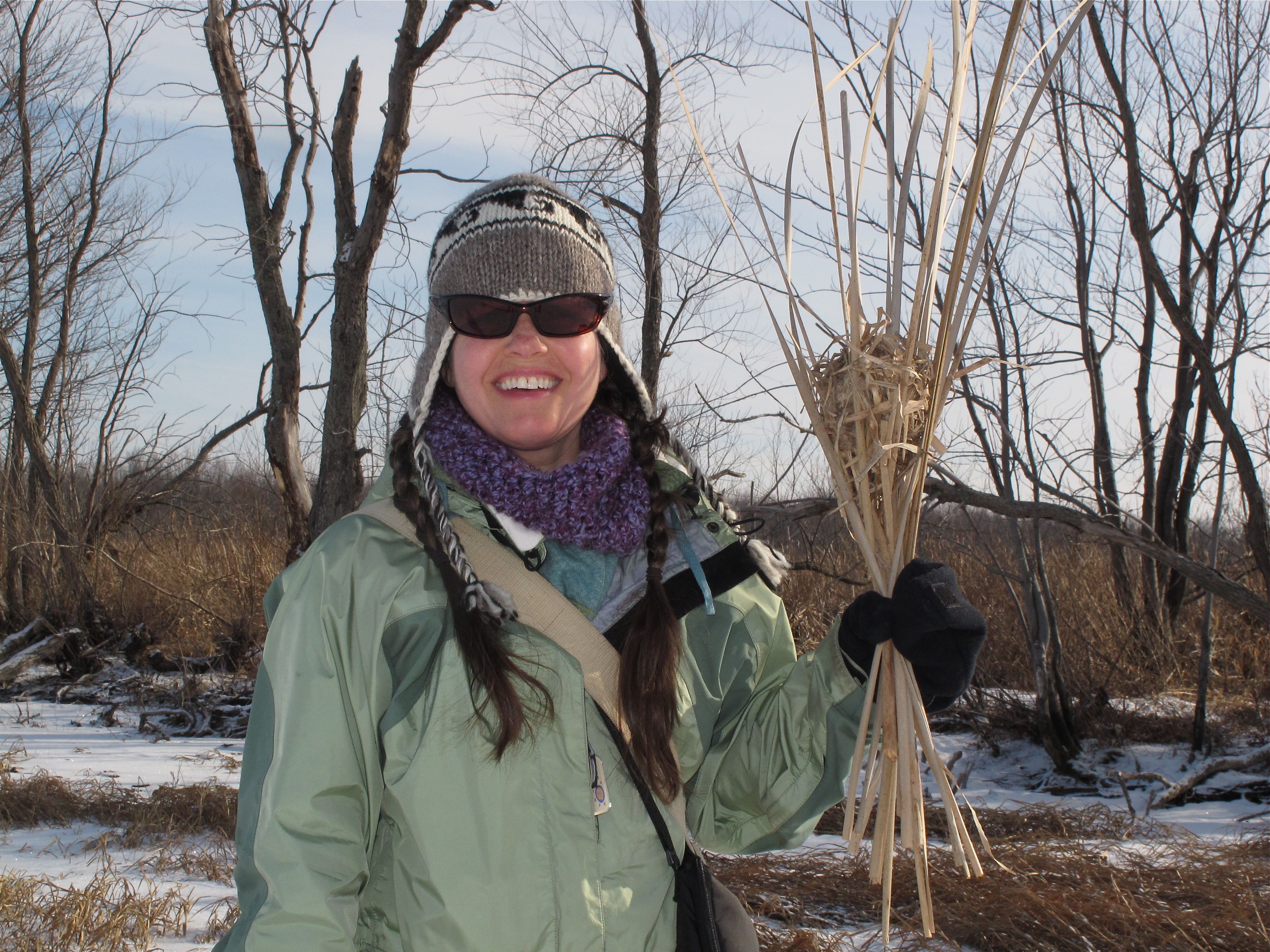 Other than the human presence, and the footprints of wild creatures we saw very little sign of life in the gut on that cold day. At points we followed along the raccoon super-highway, and occasionally saw a crow fly past… but the area was silent and dormant otherwise. Replacing the cacophony of summer bird sounds was the distant echo of a train. The major vegetation along the gut is tall cattails and reeds – there are old greying tree stumps but very little else. It is often battered by winds in the summer and perhaps more delicate plants find it a forbidding zone because of the winds. But the cattails are thriving – growing tall and thick in summer and leaving their brown and brittle stalks in winter as remnants of warmer days. Wedged in these stalks we found quite a few Marsh Wren nests. Some of these old homes seemed to be very haphazardly made – perhaps they were the dummy nests and never meant to hold a family. We eventually found a well-built and sturdy example of a Marsh Wren nest to cull for our natural history collection.