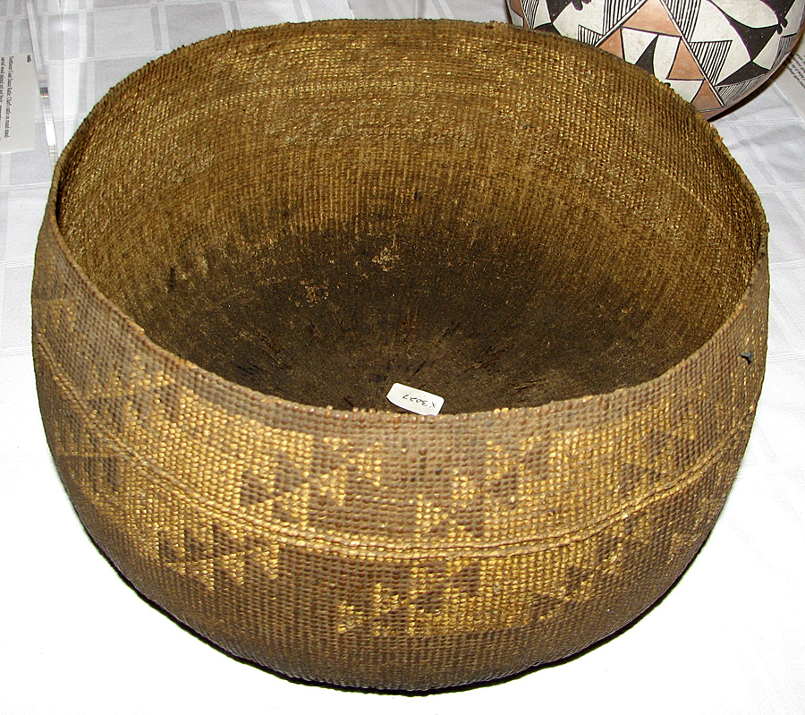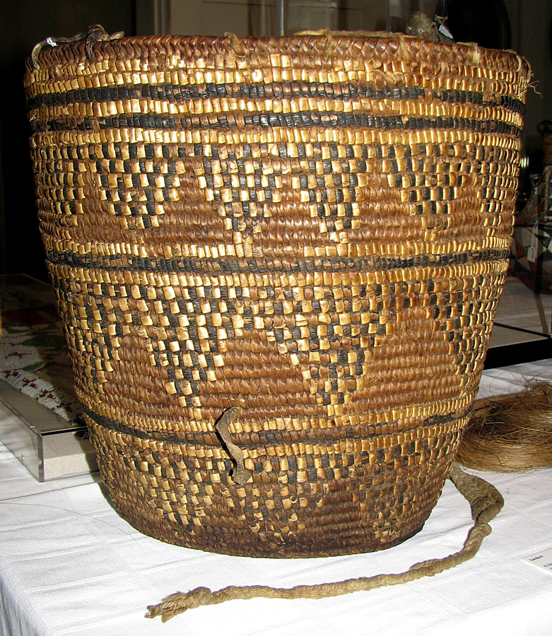 The Klickitat baskets are large burden baskets woven of red cedar root, cattail leaf, or beaver grass with geometric designs and rawhide straps. The Klickitat, or Qwu’lh-hwai-pum (prairie people), lived along the shores of the Colombia River between the present day states of Washington and Oregon.