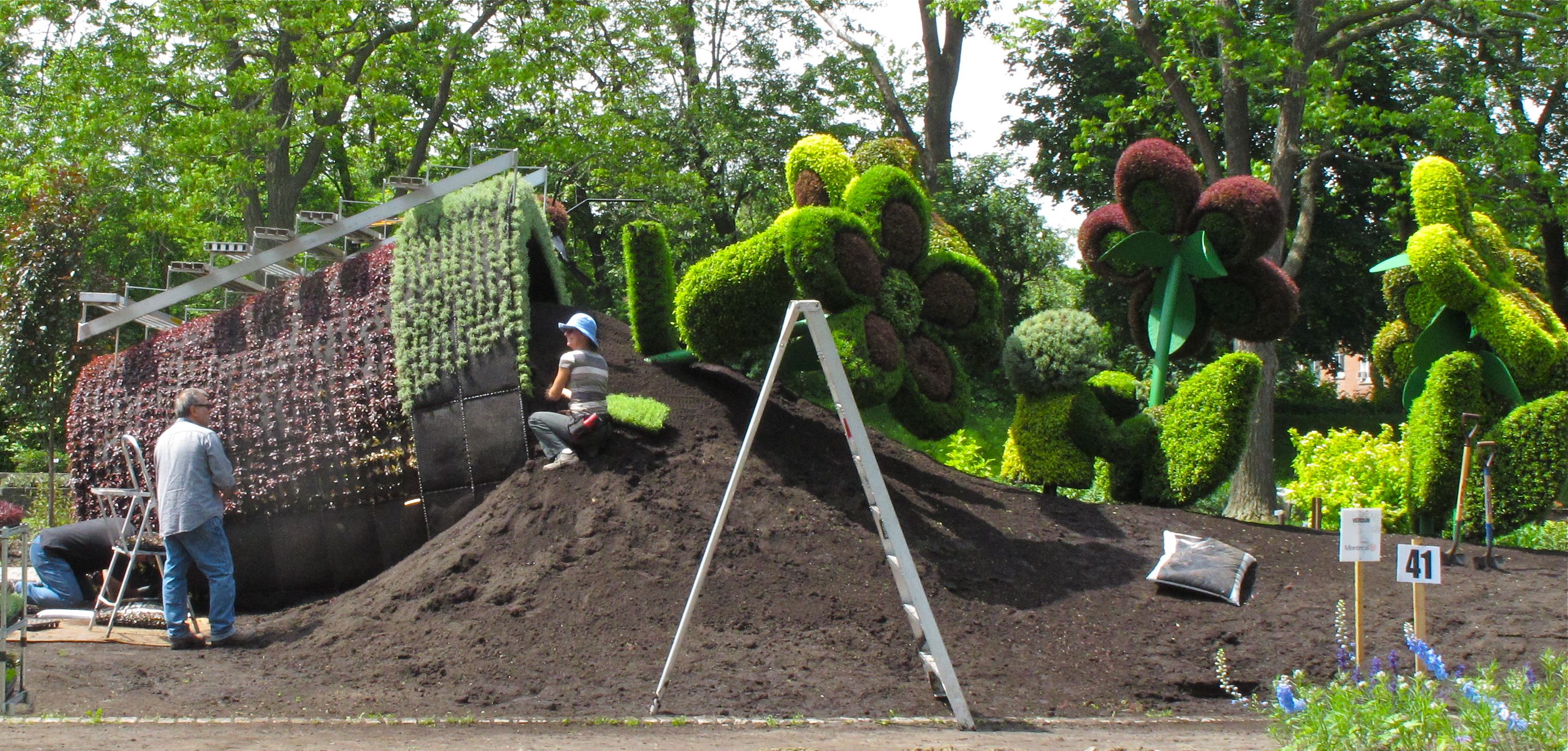 At the end of this month (June 22 to be exact) the “mosaïcultures internationales” exhibit will open at the Botanical Gardens in Montreal. Also called “the Giants of the Horticultural Arts” it features large-scale horticultural sculpture in a lovely setting. On a recent trip we were able to get a sneak peak at some of the amazing, and large, creations being assembled. There are groups of horticulture sculptors representing many different countries contributing to this exhibit… And the breadth of subjects is as varied as all of our imaginations combined!