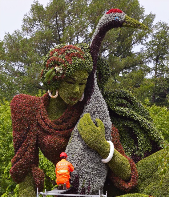 Having some difficulty figuring out the scale of these living sculptures? In the photo above you can see the man in orange adding to the foliage of the crane! The seated female figure is surrounded by a flowing stream and other cranes of a smaller size than the one she embraces.
