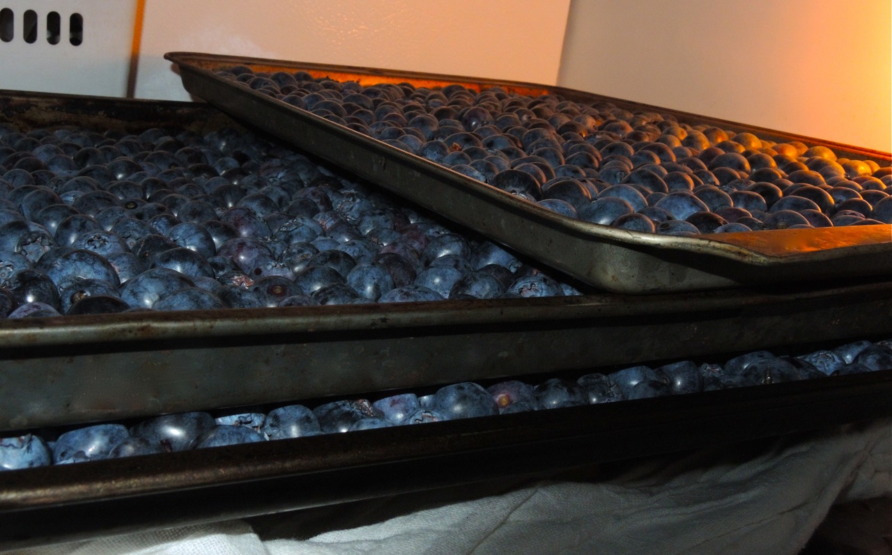 The berries on trays in the freezer. Of course we left a few pounds out in the fridge for immediate use! It’s amazing how much longer they keep than the blueberries bought at the store. I feel like a bear every time I grab a handful for a snack!