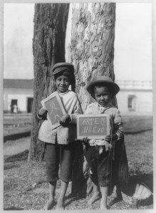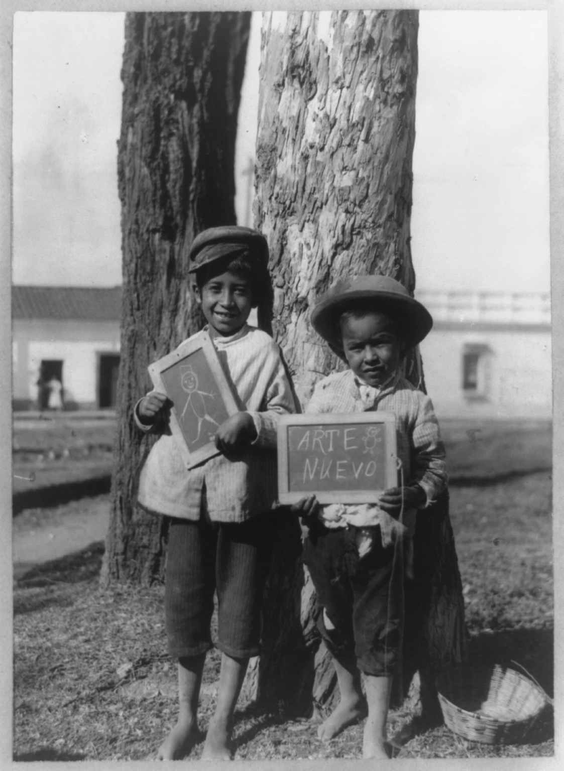 Two small boys holding up their drawings on small blackboards, Nicaragua, ca. 1915
