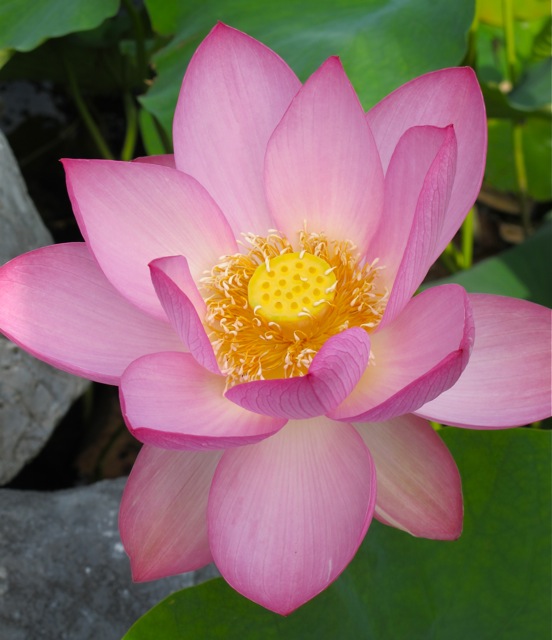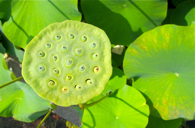 The eventual result after the lotus flower has lost it’s petals is the large seed pod that – to me – resembles an old-fashioned shower head. This day we saw all stages of the lotus, from just budding to petals gone or falling as we watched. One lotus even had a large spider poised on it’s stamen waiting for it’s eventual meal of tender, juicy bee.