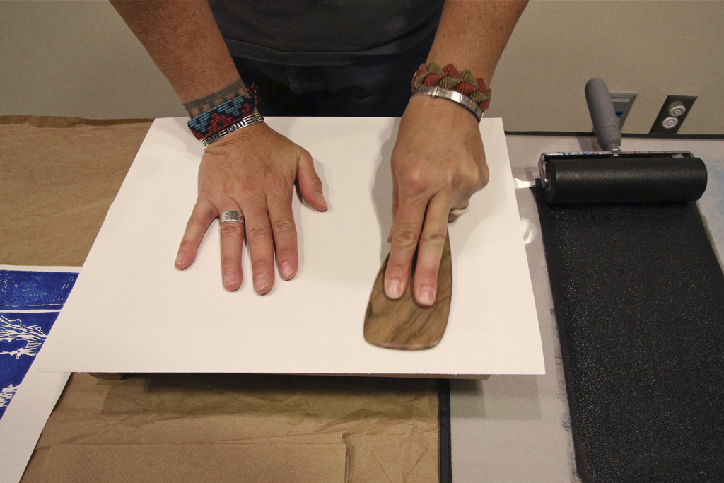 rubbing the back of the paper to impress the ink