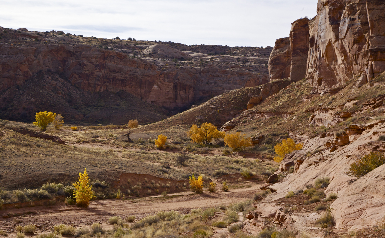 Autumn color had begun appearing in the cottonwoods and other deciduous trees in the canyon, and the hike into the wash was dry and relatively easy going (at least on the way in… it would feel far more difficult to our tired bodies on the way back to our campsite that evening). Stopping frequently to explore and take photos, we saw a few handfuls of people later in the morning as they caught up with us on the trail.