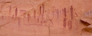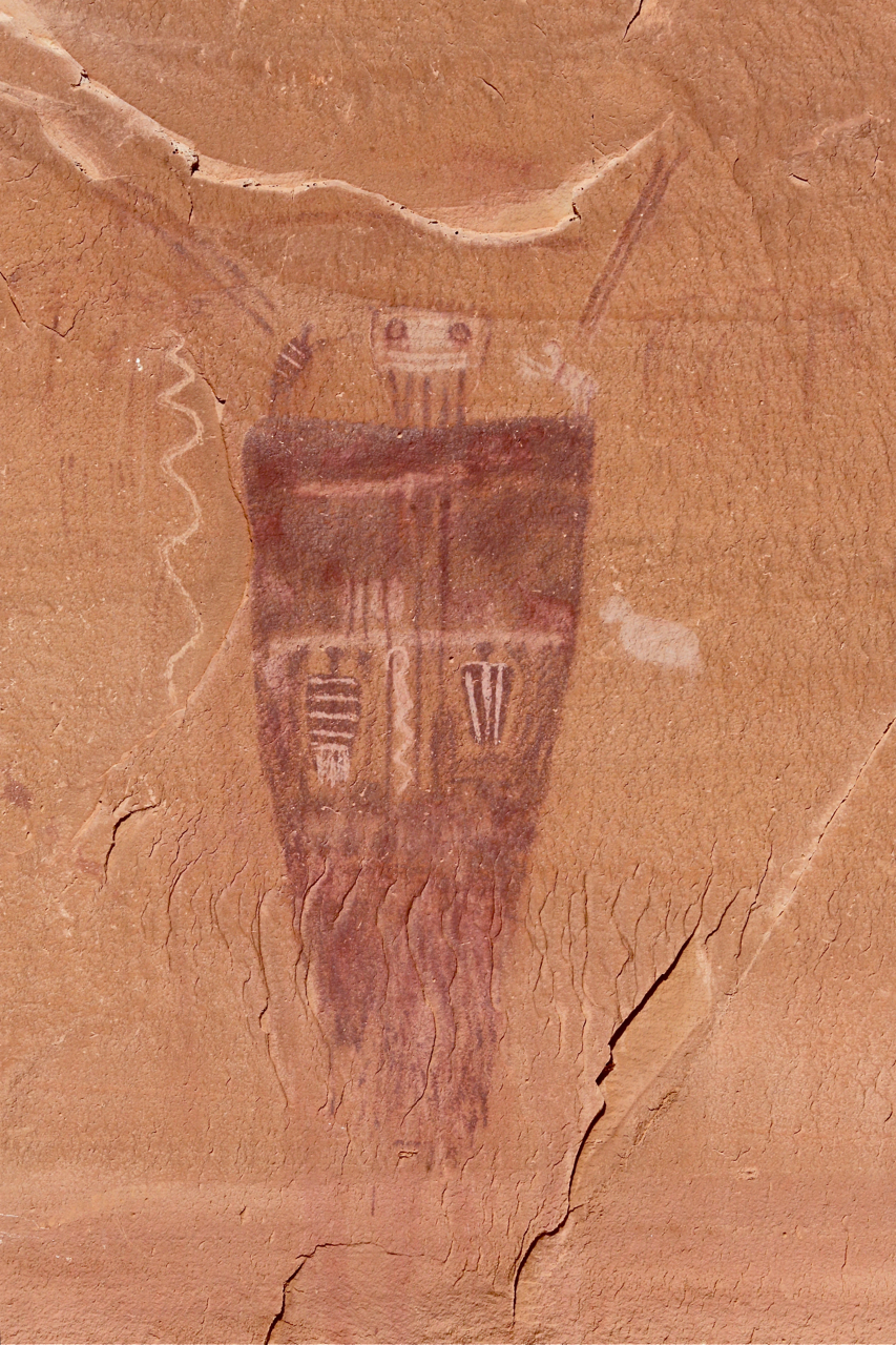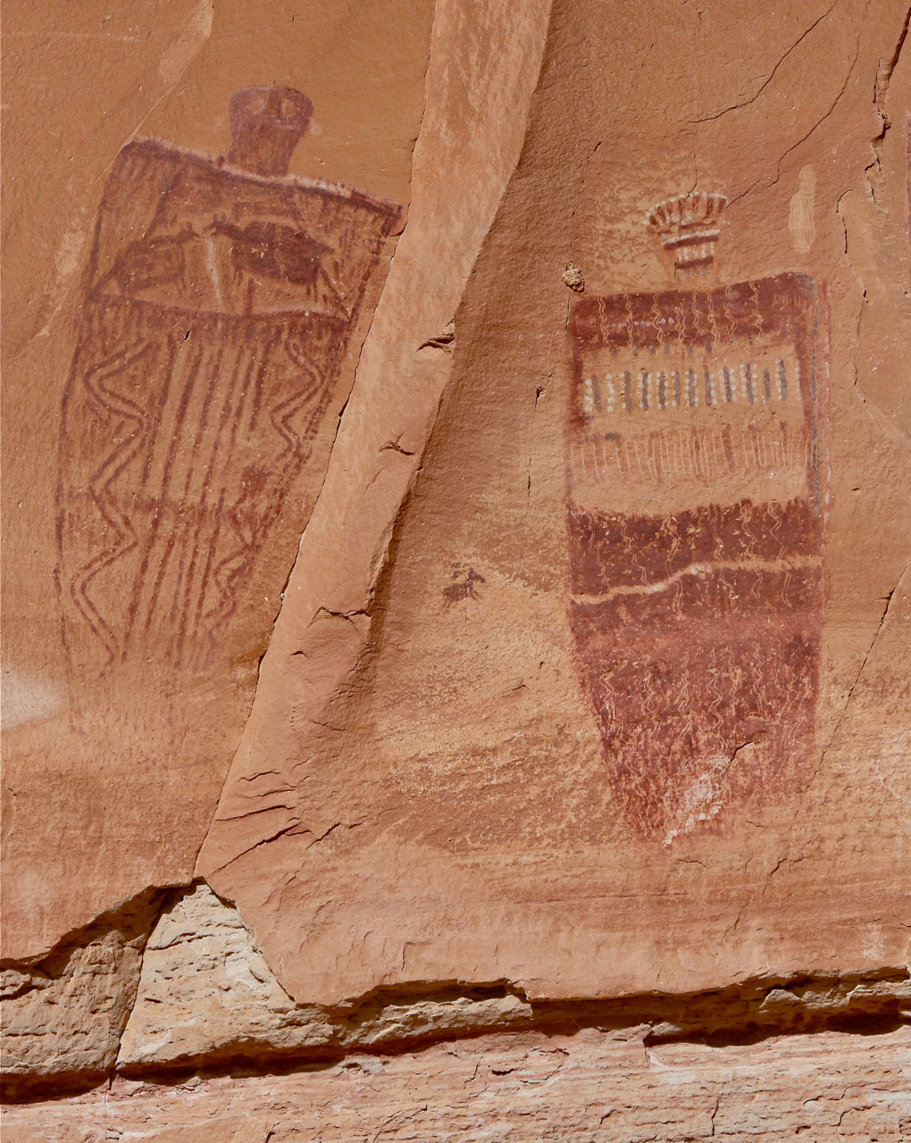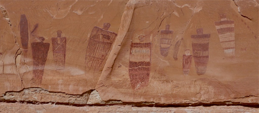 This site captivated me so when I studied it in college because of mysterious appearance and sheer size of many of the figures. The paintings indicate to many who have studied them that these people were not only trying to convey a message, but also probably simply enjoyed the medium of painting. The images are often human-sized or larger, often armless, with interesting and varied designs comprising the body of the figure. There are much smaller, more recent additions done by Fremont and Ancestral Puebloan people that are lyrical, life-like and beautiful. I was deeply interested in symbols and American Indian art and this site represented an exciting adventure that only served to enhance the general intrigue.
