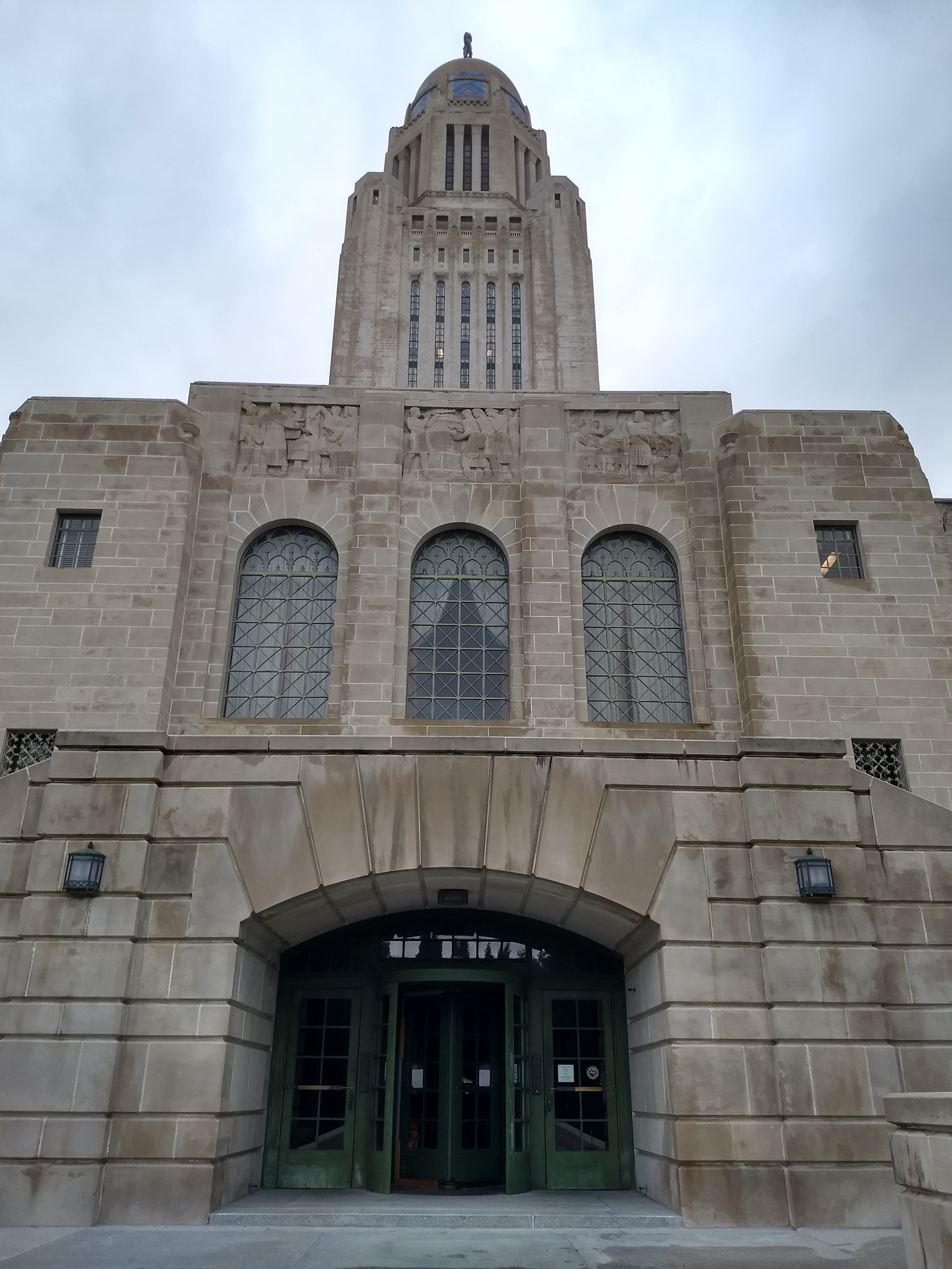 Main entry with the tower above and behind