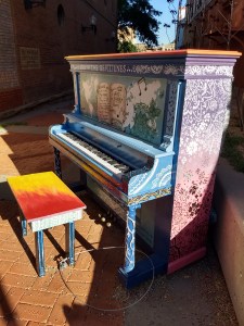 there are numerous pianos on the sidewalks around town